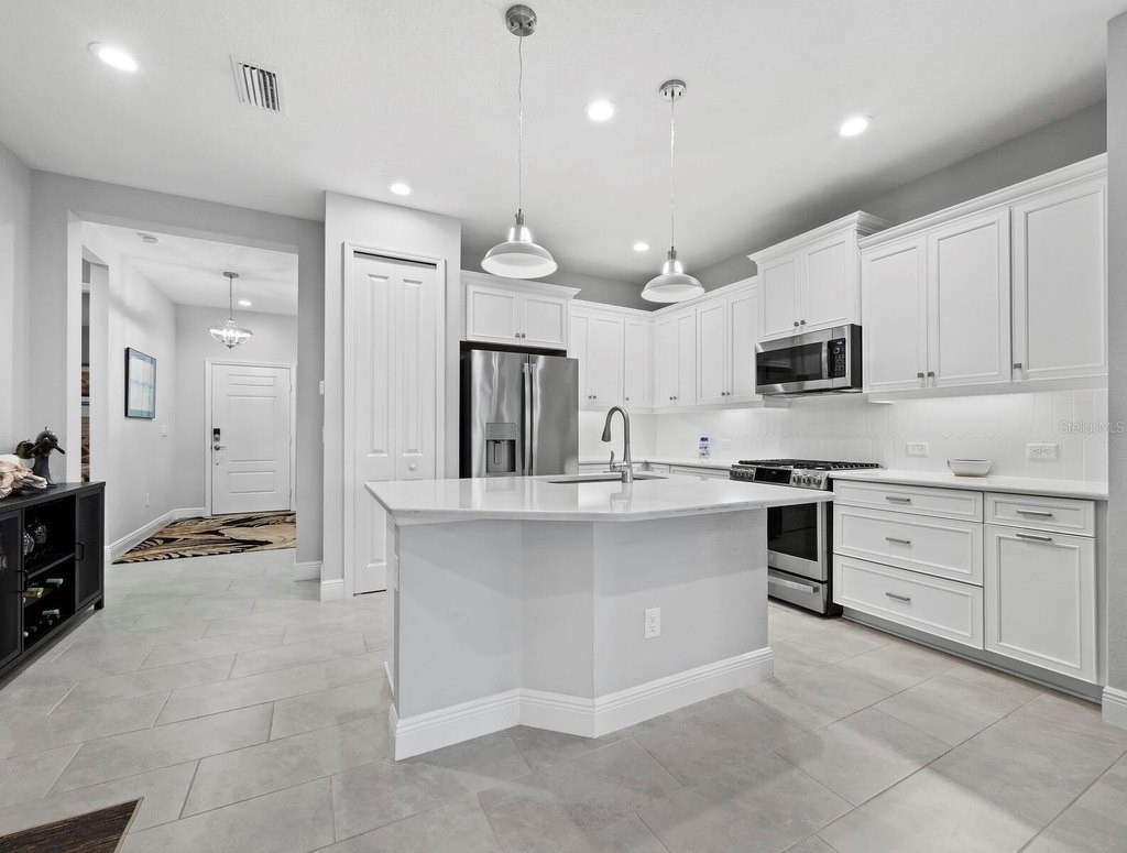Step into refined Florida living in Windward, where a smart, open layout pairs everyday comfort with easy entertaining. The cook’s kitchen anchors the home with soft-close cabinetry, under-cabinet illumination, oversized sink, and a gas range, flowing seamlessly into a generous great room framed with a coffered ceiling. Durable tile floors in main living areas and Luxury Vinyl Plank flooring in bedrooms and den, complemented by upgraded lighting, and 8' interior doors all provide for a clean, elevated feel. Need a quiet spot to focus? The double French-door entry into your den/flex room is ideal for work, hobbies, or guests. The private primary suite features two closets (one walk-in), a ceiling fan, and a refreshed en-suite with an upgraded shower. Thoughtful quality continues with whole house impact-resistant windows and doors and blinds on all windows. Outdoor living shines: relax on the extended, screened lanai with pavers and ceiling fan, taking in treed scenery with a water view—perfect for morning coffee and evening cocktails. It’s plumbed with a dedicated gas line for grilling, and rear/front hose spigots for everyday convenience. And everyday living is made easy with a spacious laundry room and a two-car garage with a utility sink. Other thoughtful updates include added insulation in the exterior block walls and garage doors, closet organizer systems, and window tint for efficiency. Windward living means resort perks: resort-style pool and splash pad, spa, modern fitness center, 8 pickleball courts, 2 tennis courts, sports fields, clubhouse, dog parks, playgrounds, miles of trails, and a full-time activities director. With direct access to Waterside Place and quick reach to Lakewood Ranch Main Street, downtown Sarasota, I75, premier beaches, dining, culture, and championship golf, you’re at the center of it all. Crisp, move-in ready, and thoughtfully upgraded—come see why this villa stands out.